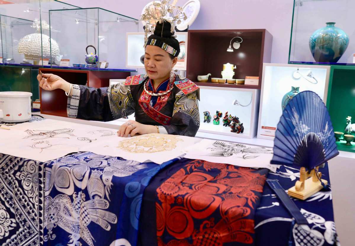 Yang Fang, an intangible cultural heritage inheritor, demonstrates wax printing at an exhibition of Guizhou on Aug 9, 2019 [Photo by Zhu Xingxin/chinadaily.com.cn]