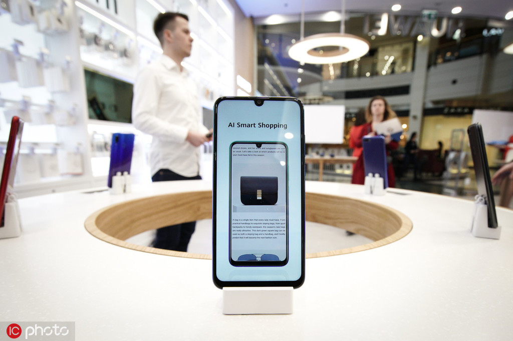 A Huawei mobile phone is seen displaying its AI shopping feature at the flagship store in Warsaw, Poland on March 27, 2019. [Photo/IC]