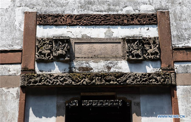 Photo taken on Aug. 8, 2019 shows the decorations on buildings in Luotian Village, Anyi County, east China's Jiangxi Province. Luotian, Shuinan and Jingtai Villages in Anyi County each has a history of over 1,400 years. They together have more than 120 intact old mansions dating from Ming and Qing dynasties (1368-1912). Thanks to integrated planning and effective management, they are now popular tourist attractions based on the weight of history and unique Gan culture. In 2018, the three ancient villages received over 200,000 visitors. [Photo by Jiang Hongjing/Xinhua]
