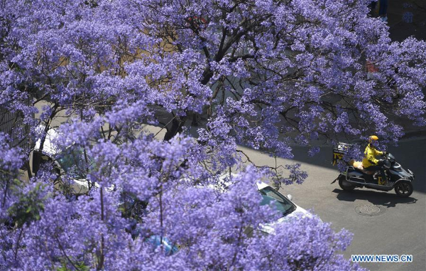 Photo taken on April 24, 2019 shows the blooming jacaranda on street in Kunming, southwest China's Yunnan Province. [Photo/Xinhua]