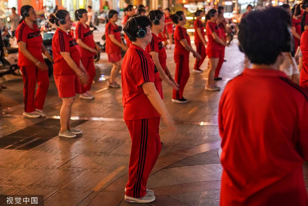 Square dancers sport headsets in Nanning, South China's Guangxi Zhuang autonomous region on Aug 9, 2019. [Photo/Chinanews.com]