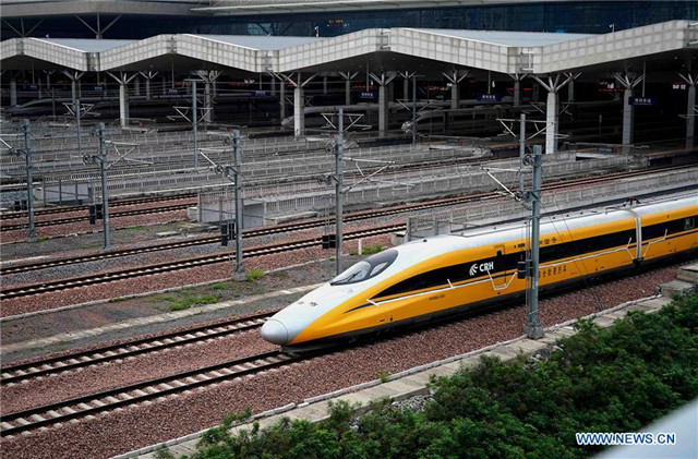 A comprehensive inspection train leaves Zhengzhou East Raiwlay Station in Zhengzhou, central China's Henan Province, Aug. 13, 2019. The Henan section of Zhengzhou-Wanzhou railway started a joint test on Tuesday. With a designed speed of 350 km per hour, the Zhengzhou-Wanzhou railway is an important part of railway system in Henan Province. The Zhengzhou-Wanzhou railway links Zhengzhou in central China's Henan Province and Wanzhou in southwest China's Chongqing Municipality. [Photo by Li An/Xinhua]