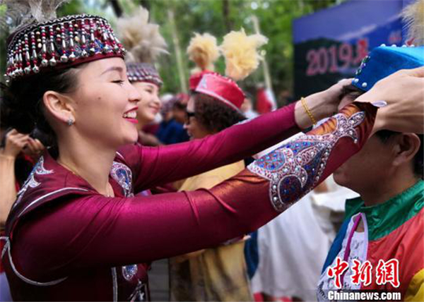 Altay locals welcome tourists with hats. [Photo/chinanews.com]