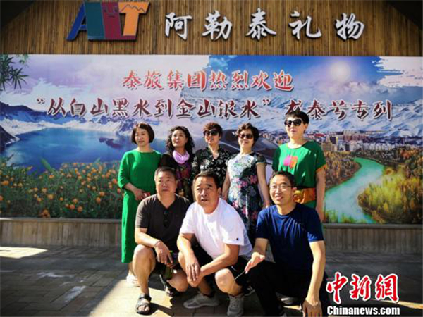 Heilongjiang tourists pose for a group photo in Altay, Northwest China’s Xinjiang Uygur autonomous region, on Aug 7. [Photo/chinanews.com]