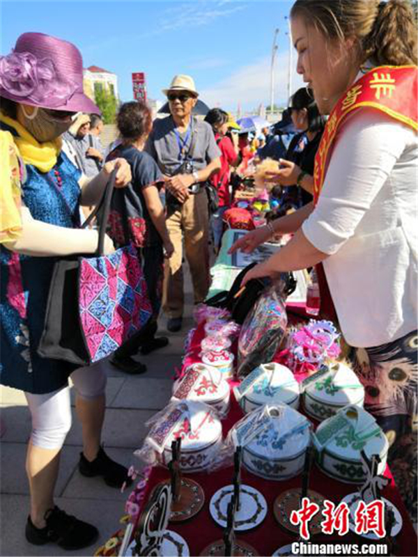 Heilongjiang tourists stroll through a handicraft exhibition area in Altay, Northwest China’s Xinjiang Uygur autonomous region, on Aug 7. [Photo/chinanews.com]