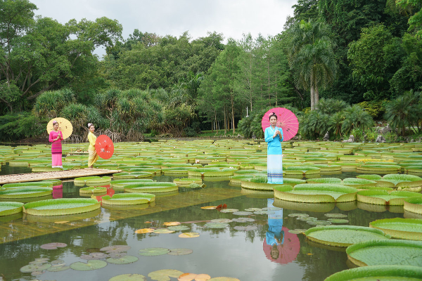 Its leaf features thorns that face toward the water, which provide the plant a means of protection, and the Lotus Victoria's flower changes color from white to pink and then to purplish pink for each of its three days in blossom.