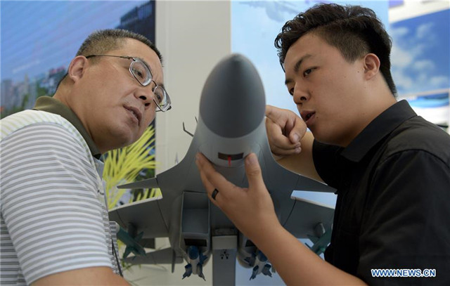 An exhibitor introduces a model of an aeroplane to a visitor during the 14th China Xi'an International Science & Technology Industry Expo and Hard & Core Technology Industry Expo at Qujiang International Conference and Exhibition Center in Xi'an, capital city of northwest China's Shaanxi Province, Aug. 15, 2019. The expo opens on Thursday and will showcase fruits covering fields including artificial intelligence, aerospace, biological technology and information technology. [Photo by Liu Xiao/Xinhua]