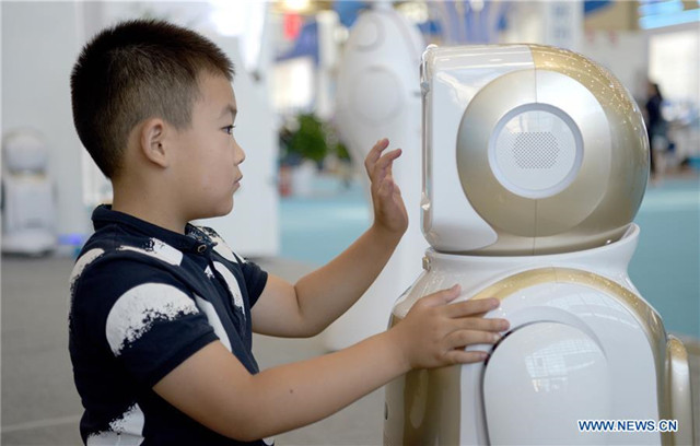 A child interacts with an android during the 14th China Xi'an International Science & Technology Industry Expo and Hard & Core Technology Industry Expo at Qujiang International Conference and Exhibition Center in Xi'an, capital city of northwest China's Shaanxi Province, Aug. 15, 2019. The expo opens on Thursday and will showcase fruits covering fields including artificial intelligence, aerospace, biological technology and information technology. [Photo by Liu Xiao/Xinhua]