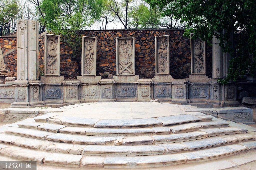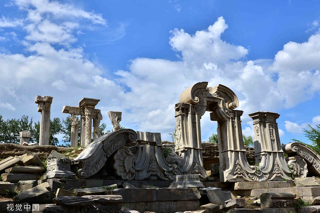 Stone remains near a fountain. The Qianlong Emperor (r. 1736-1795) used to sit here against the carved stone-panel screen to watch the jetting of water by the Western-style fountain in the garden. [Photo/VCG]