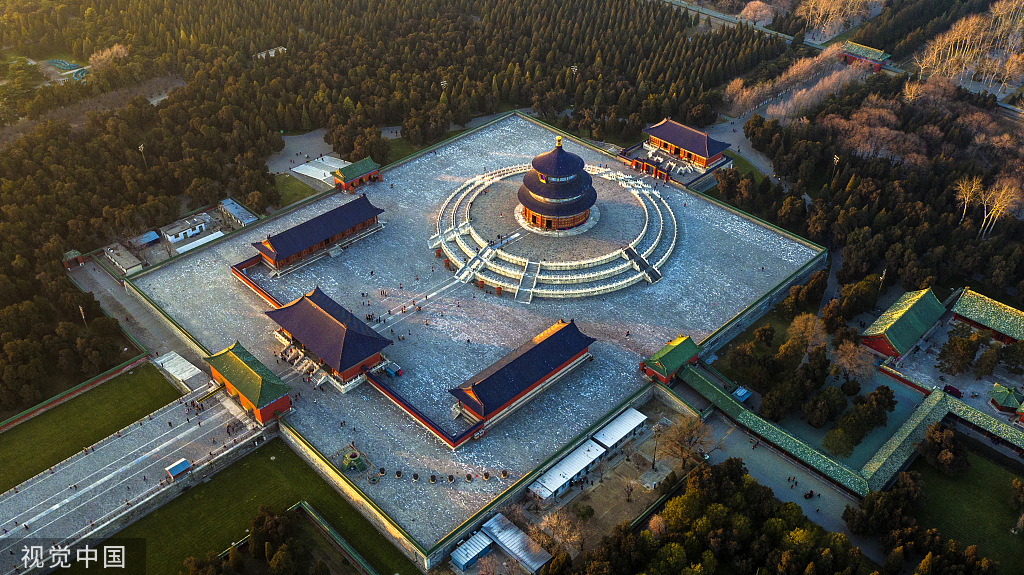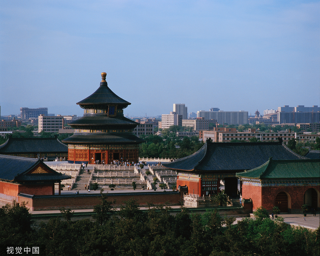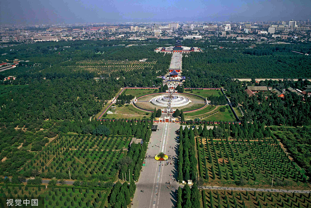 Architectural structures are primarily situated in the inner altar area, with the two centerpieces -- the Hall of Prayer for Good Harvests (Qinian dian) in the north and the Circular Mound (Yuan qiu) in the south -- connected by a raised path 360 meters in length, which forms a central axis of the entire layout. The Temple of Heaven is the world's largest architectural complex dedicated to heavenly worship. It was inscribed on the World Heritage List in 1998.
