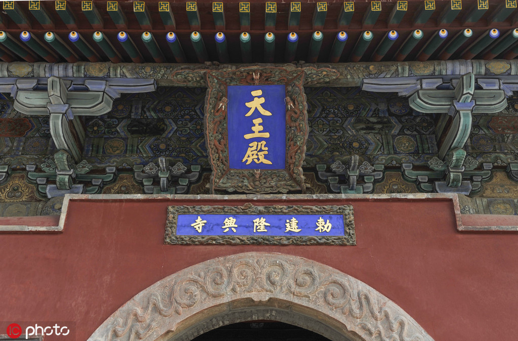 The Longxing Temple underwent two major renovations during the Qing dynasty Kangxi (1662-1722) and Qianlong (1736-1795) reigns. These two blue plaques bearing golden characters hanging on the facade of the Hall of Heavenly King were both inscribed by the Kangxi emperor. [Photo/IC]