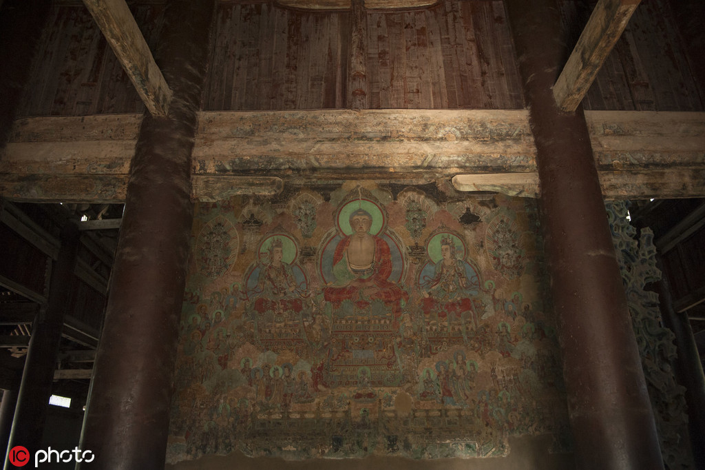 Surviving mural paintings inside the Hall are largely dated to the Ming Dynasty (1368-1644), a continuation of the painting techniques used in the previous Tang and Song dynasties (618-1279). It typifies Han Chinese style Buddhist murals and is among the largest murals in north China's Beijing-Tianjin-Hebei region. A contrasting color scheme of red, green, blue, ochre, and white mineral pigments gives the Buddhist stories depicted a strong visual impact. Buddhist figures in the mural paintings are all portrayed in Han Chinese style.