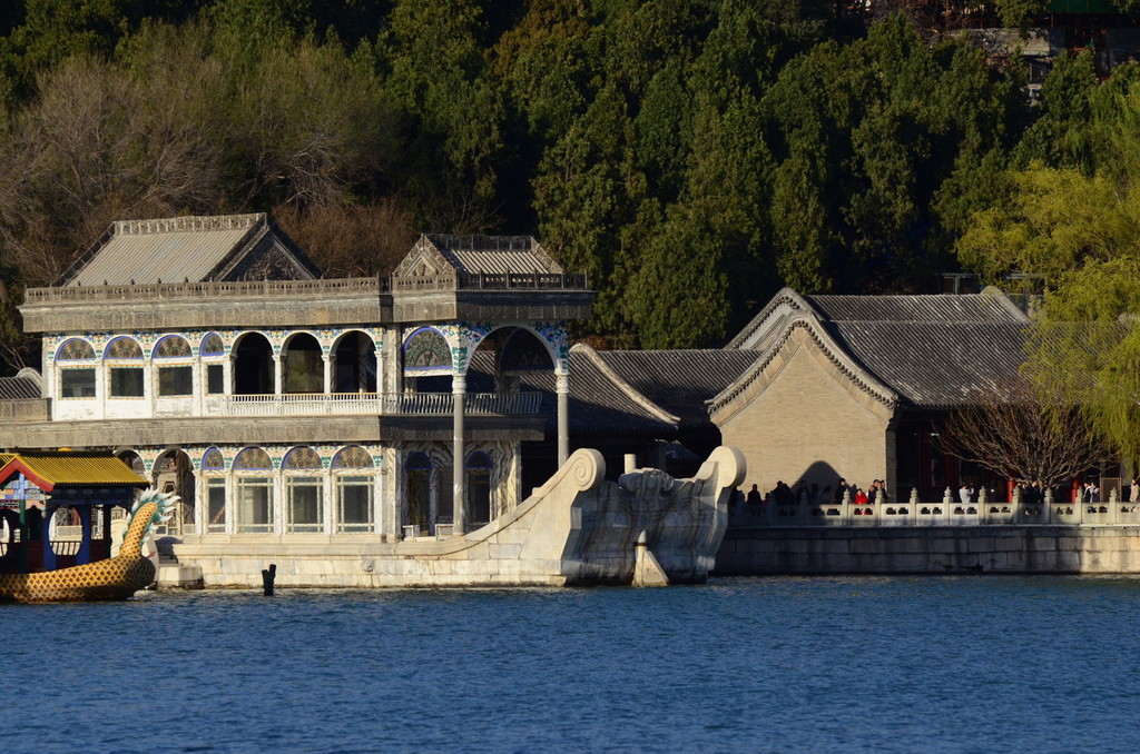 Completed in 1755 during the Qianlong reign, the 36-meter long boat was built on water with large chunks of stone as its frame. The original wooden cabin in traditional Chinese style was burned in 1860, and was replaced by a Western style one in 1893.