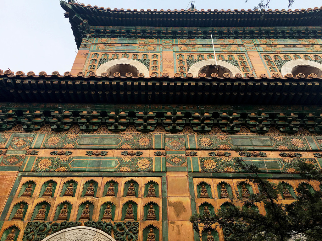 Commissioned by the Qianlong Emperor, the Sea of Wisdom is a religious sanctuary built of brick and stone. The arched stone structure replaced beams to bear the weight of the roof. The ceiling and the wall paintings are decorated with glazed tiles. Over a thousand niches containing Amitabha Buddha statues on the exterior walls and other Buddhist statues in the hall houses are all dated to the Qianlong period. In 1900, the glazed Buddha statues on the exterior walls were brutally damaged by the Eight-Nation Alliance.