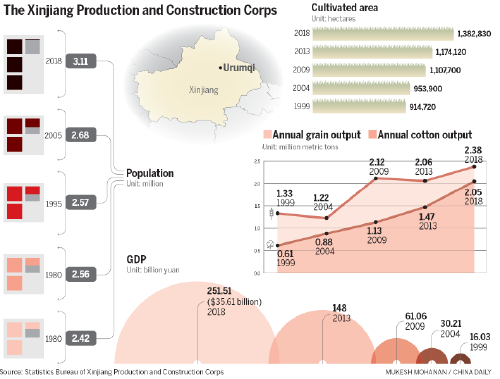 According to the Ministry of Agriculture and Rural Affairs, agricultural machines now do 94 percent of the corps' farm work, 26 percentage points higher than the national average for mechanization rates. The corps also uses 43 planes to help sow seeds and spray pesticides.