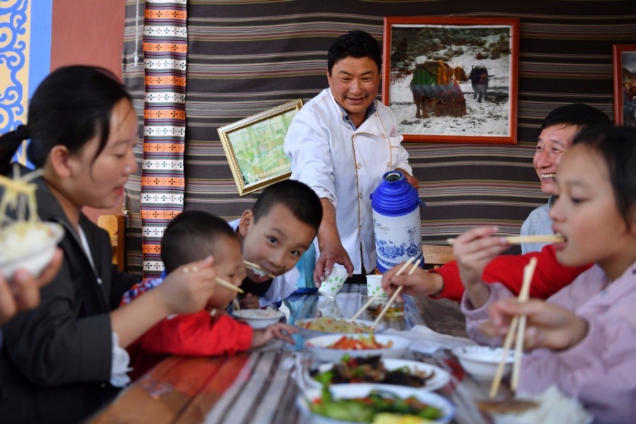 A villager serves water for guests in Gaxiu village of Gahai township, Luqu county, Gannan Tibetan autonomous prefecture, northwest China's Gansu province, Aug 13, 2019. In recent years, Gannan promoted culture and tourism industry to boost income of local people.[Photo/Xinhua]