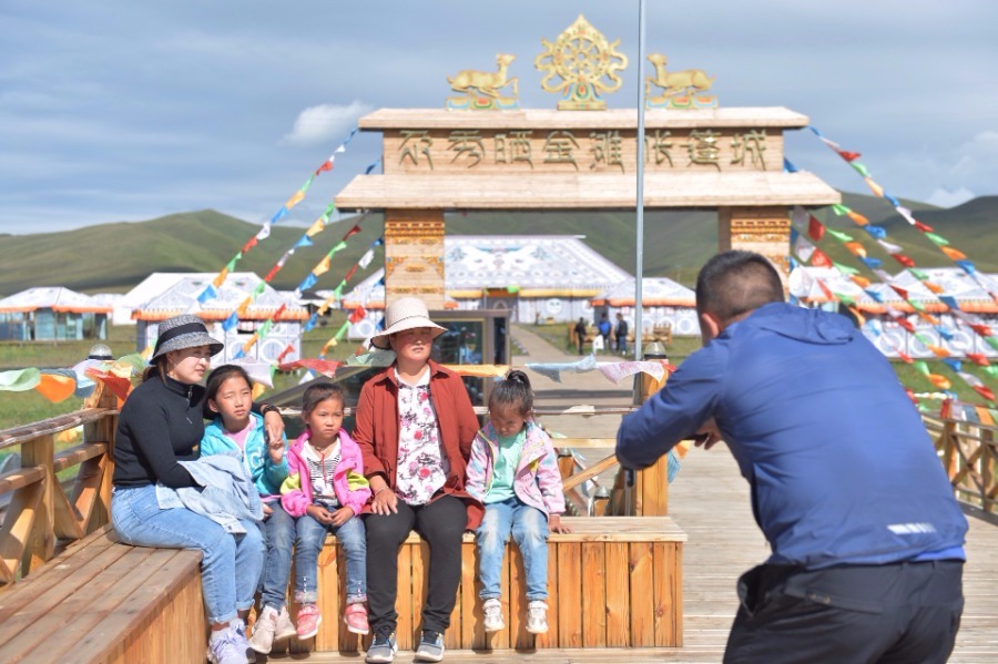 Tourists pose for a photo at a tent scenic spot in Gaxiu village of Gahai township, Luqu county, Gannan Tibetan autonomous prefecture, northwest China's Gansu province, Aug 13, 2019. In recent years, Gannan promoted culture and tourism industry to boost income of local people. [Photo/Xinhua]