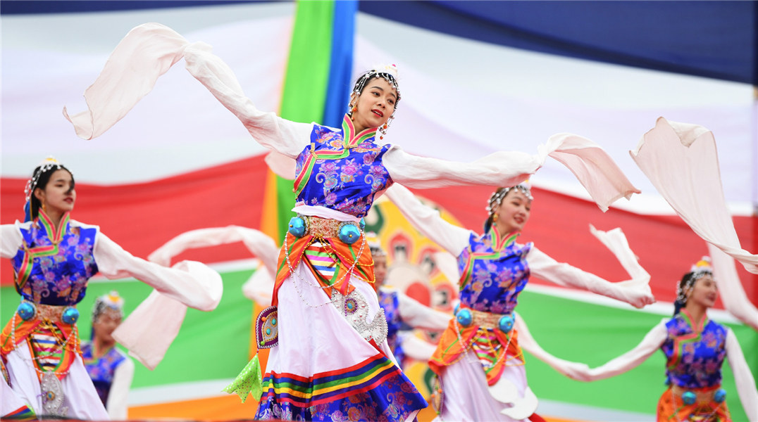 Dancers perform at the festival's opening ceremony in Northwest China's Gansu province, on Aug 13, 2019. [Photo/Xinhua]