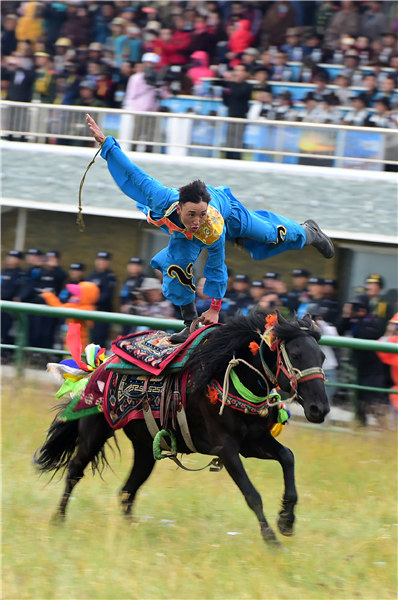 A horse rider showcases equestrian skills at the festival's opening ceremony in Northwest China's Gansu province, on Aug 13, 2019. [Photo/Xinhua]