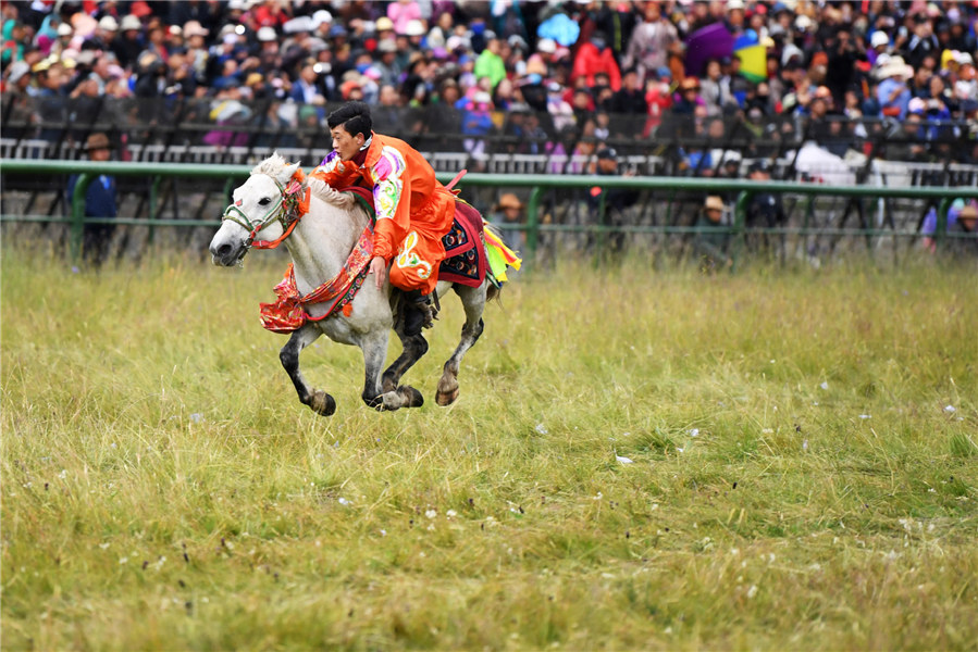 A horse rider showcases equestrian skills at the festival's opening ceremony in Northwest China's Gansu province, on Aug 13, 2019. [Photo/Xinhua]