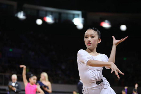 A young dancer performs at the 2019 Blackpool Dance Festival (China) in Shanghai Baoshan Sports Center on Sunday. [Photo provided to China Daily]