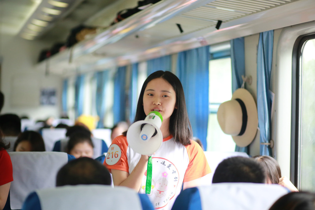 A single woman speaks through a megaphone on the "Love-Pursuit Train" on Aug 10, 2019. [Photos by Su Zhigang and Hu Yafei/For chinadaily.com.cn]