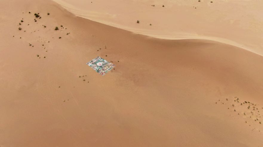 The embossed sand painting is displayed in the desert of Dunhuang of Northwest China's Gansu province in August 2019. [Photo provided to chinadaily.com.cn]