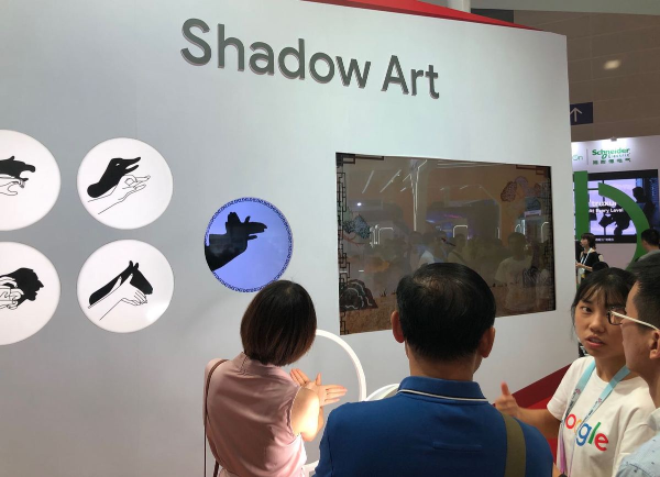 A Google staff member introduces the interactive shadow play, where visitor's hand postures are projected on a screen and captured by AI, to become the character of a shadow puppetry show, Aug 26, 2019. [Photo by Wang Junwei/chinadaily.com.cn]