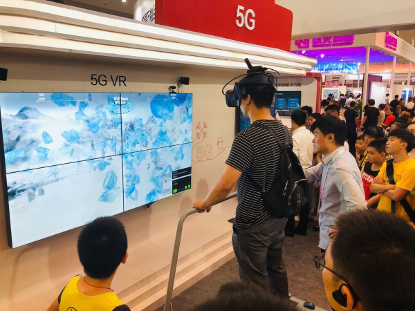 A visitor tries virtual skiing by wearing a 5G VR device at Huawei's booth at the Chongqing International Expo Center in Chongqing, Aug 26, 2019. [Photo by Wang Junwei/chinadaily.com.cn]