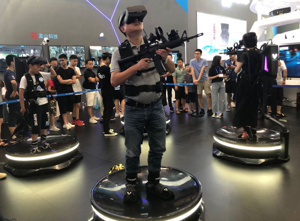 Visitors enjoy immersive VR experience at the Chongqing International Expo Center in Chongqing, Aug 26, 2019. [Photo by Wang Junwei/chinadaily.com.cn]