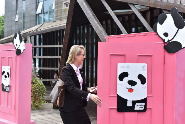 A visitor takes a look at the model of the panda-themed credit card issued at the Chengdu Research Base of Giant Panda Breeding, Chengdu, Southwest China's Sichuan province, Aug 27, 2019. [Photo provided to chinadaily.com.cn]