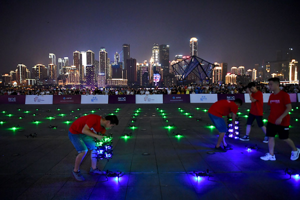 A total of 250 drones stage a show over the south bank of the Yangtze River on Monday night. [Photo by Guo Xu/chinadaily.com.cn]