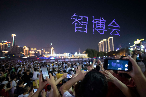 People in Chongqing enjoy a spectacular show in the sky performed by 250 drones over the south bank of the Yangtze River on Monday night. [Photo by Guo Xu/chinadaily.com.cn]