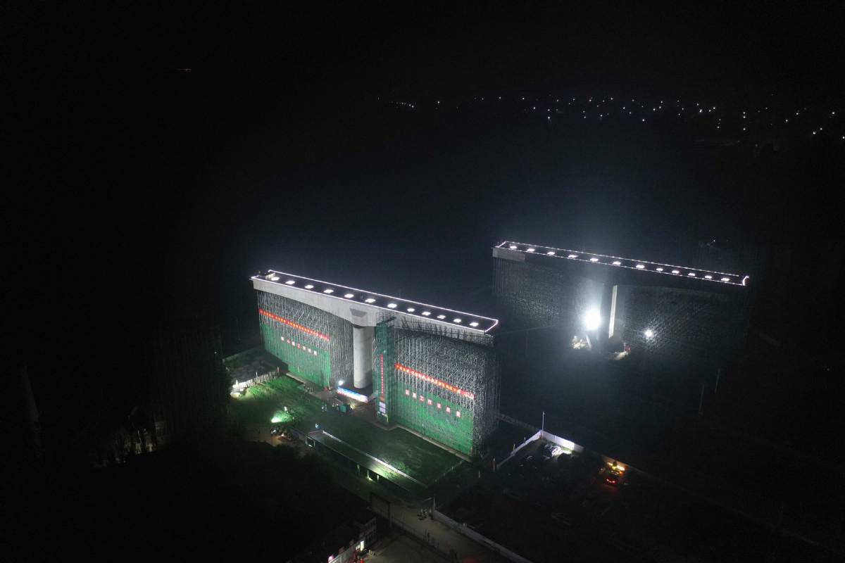 Aerial photo taken on Aug 26, 2019 shows two separate parts of a swivel railway bridge of Beijing-Xiongan intercity high-speed railway before being rotated to their targeted positions across the Tianjin-Baoding high-speed railway in Xiongan New Area, North China's Hebei province. [Photo/Xinhua]