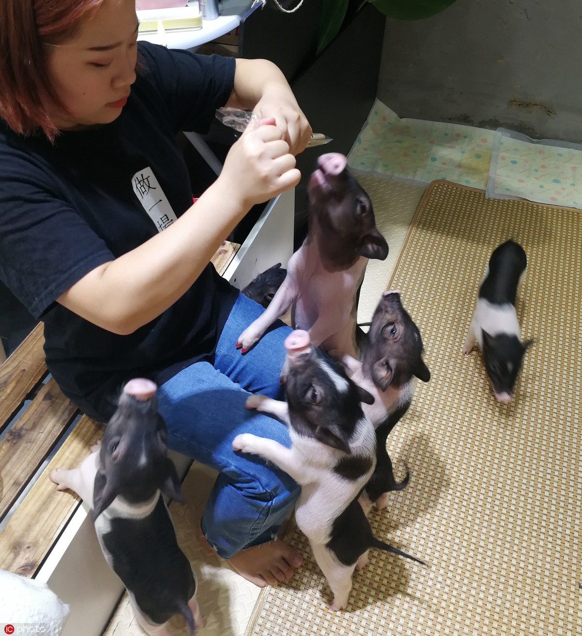 A woman plays with piglets at a cafe in Hangzhou, East China's Zhejiang province, Aug 24, 2019. [Photo/IC]