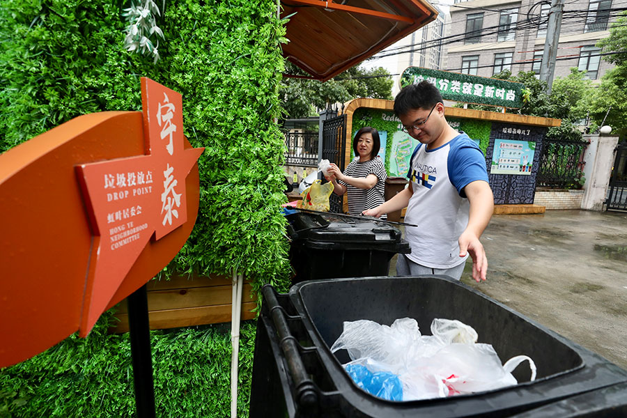 Residents put sorted garbage into appropriate rubbish bins at a community in Hongkou district, Shanghai, on Aug 29, 2019. [Photo by Zhu Xingxin/chinadaily.com.cn]