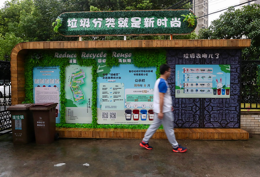 A man walks by an information board on sorting garbage at a community in Hongkou district, Shanghai, on Aug 29, 2019. [Photo by Zhu Xingxin/chinadaily.com.cn]