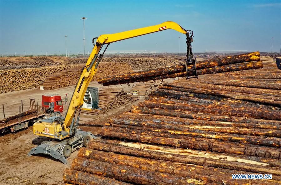 Aerial photo taken on Aug 27, 2019 shows a wood storage yard at Wenfeng port in the China (Hebei) Pilot Free Trade Zone Caofeidian area in North China's Hebei province. China (Hebei) Pilot Free Trade Zone (FTZ) Caofeidian area announced its inauguration on Saturday. Caofeidian area of the Hebei pilot FTZ focuses on industries including international commodity trade, port service, energy reserve and distribution, and high-end equipment manufacturing. [Photo/Xinhua]