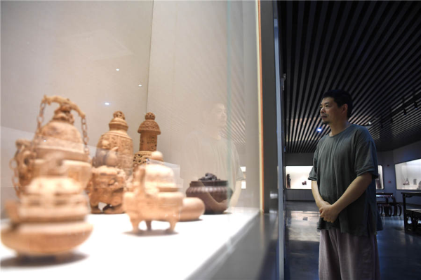 Hong Jianhua views his bamboo carving works at Huipai Carving Museum he launched in Huizhou district of Huangshan city, East China's Anhui province, Aug 28, 2019. [Photo/Xinhua]