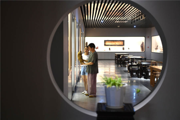 Hong Jianhua (R) expounds on a bamboo carving work to a visitor at Huipai Carving Museum he launched in Huizhou district of Huangshan city, East China's Anhui province, Aug 28, 2019. [Photo/Xinhua]