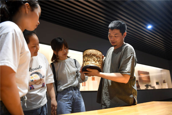 Hong Jianhua (1st R) expounds on a bamboo carving work to visitors at Huipai Carving Museum he launched in Huizhou district of Huangshan city, East China's Anhui province, Aug 28, 2019. [Photo/Xinhua]