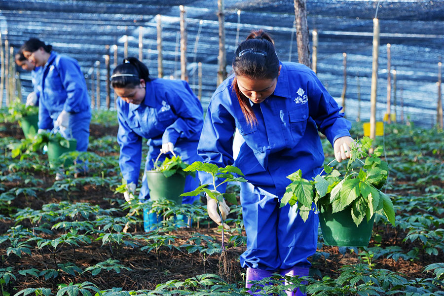 Workers check panax ginseng plants at a planting base in Wenshan prefecture, Yunnan province. [Photo/provided to chinadaily.com.cn]