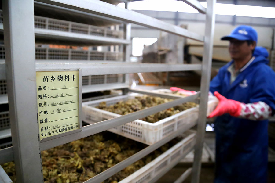 Workers store panax ginseng at a planting base in Wenshan prefecture, Yunnan province. [Photo/provided to chinadaily.com.cn]
