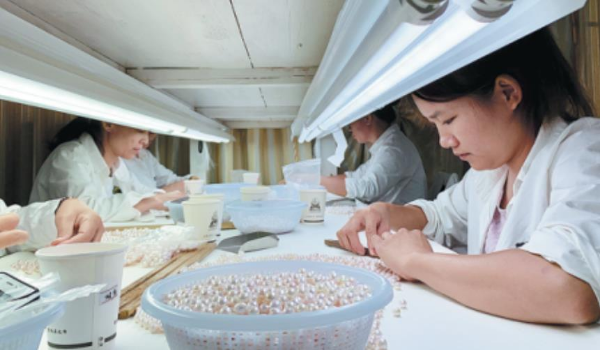 "I have increased my income. Now, I have some extra money to build savings," said Wang Qinying, who works in pearl quality control.