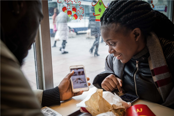 Overseas students check out shoes on the Taobao platform at a restaurant in Dalian, Liaoning province. [Photo by Niu Jing / For China Daily]