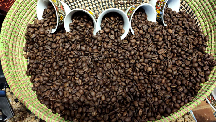 A woven basket full of Ethiopian coffee beans is shown at the Ethiopian exhibition area during the Beijing International Horticultural Exhibition in Yanqing District of Beijing, capital of China, Sept 6, 2019. [Photo by Dai Yuanyuan/chinadaily.com.cn]