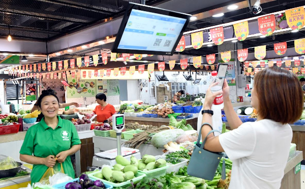 A consumer uses WeChat Pay to pay for shopping at a farmers market in Hangzhou, Zhejiang province. Consumers can also use the app to get sourcing and harvesting information about vegetables on a daily basis. [Photo by Wu Yuanfeng/For China Daily]