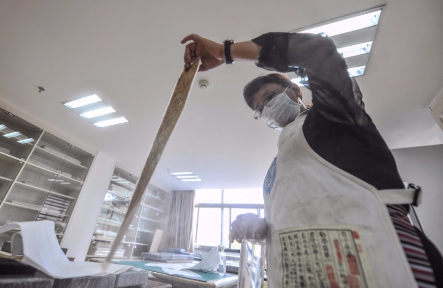 A staff member cleans an ancient document at the ancient documents protection center of Tibet in Lhasa, Southwest China's Tibet autonomous region, Sept 12, 2019.[Photo/Xinhua]