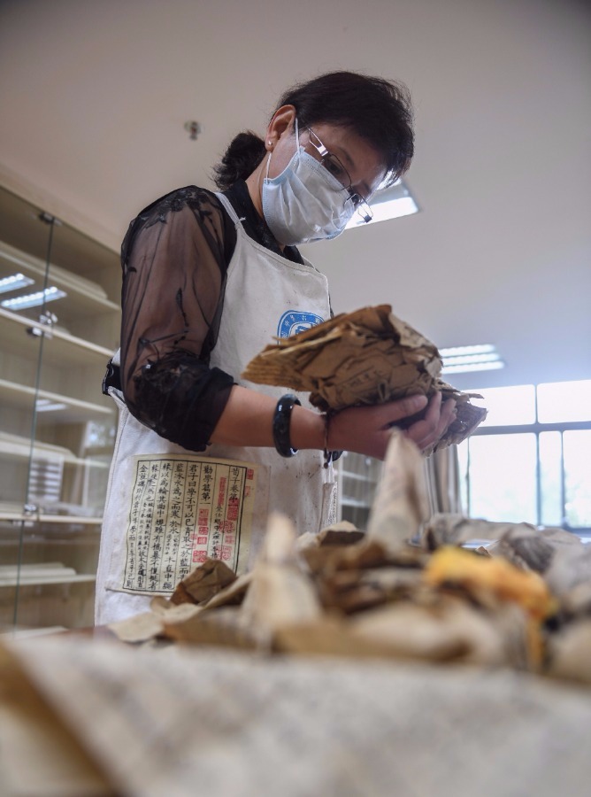 A staff member examines ancient documents with a history of more than 500 years at the ancient documents protection center of Tibet in Lhasa, Southwest China's Tibet autonomous region, Sept 12, 2019. [Photo/Xinhua]
