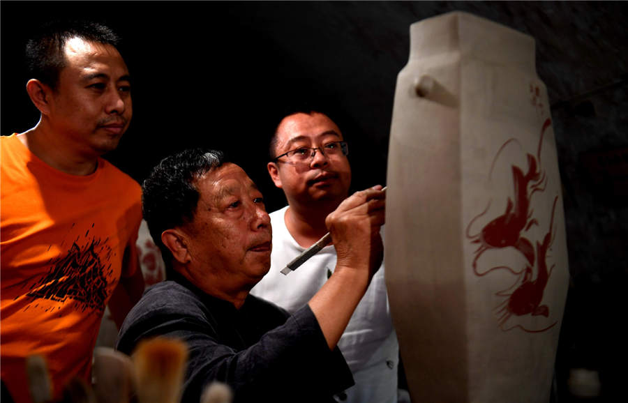 Liu Lizhong (C) guides his sons on making Cizhou Kiln porcelain at a museum in Handan city, North China's Hebei province, Sept 12, 2019. [Photo/Xinhua]